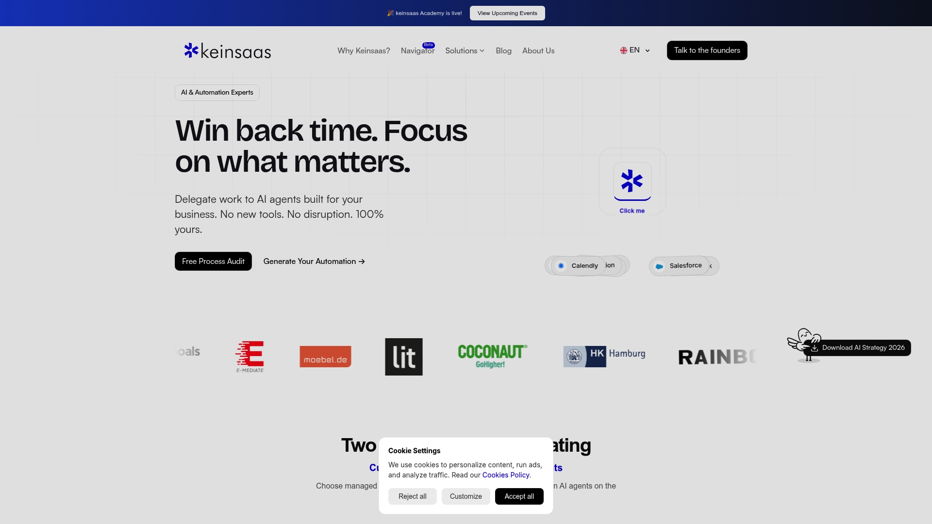 Keinsaas kombiniert Custom Automations die vom Anbieter gebaut und gewartet werden mit einer Self-Build AI Agents Plattform für Recherche, Outreach, Qualifikation und interne Abläufe. Die Firma verspricht eine Rapid Deployment-Option innerhalb von 48 Stunden und betont Ownership durch Einmalzahlung ohne Vendor Lock-In.